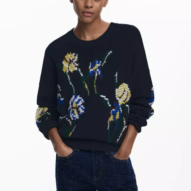 Unlike ordinary sweaters, this Desigual knitwear piece carries the brand’s signature charm — bold, lively, and feminine. Its floral pattern brings life to a simple wardrobe essential, turning it into a statement piece. Wear it to the office layered under a blazer, or dress it down with your favorite denim for a weekend outing. No matter the occasion, this sweater promises to bring comfort, warmth, and a touch of artistry to your everyday look.