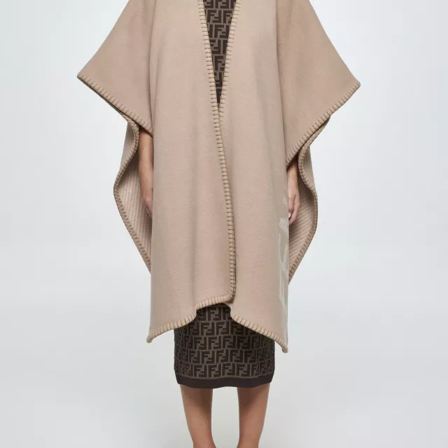 Designed with Fendi’s signature touch, this poncho features a sleek beige color that pairs beautifully with almost any outfit, making it an essential addition to your fashion collection. The chic side lettering logo adds a contemporary flair, while the rounded edges and contrasting topstitching give it a modern and sophisticated appeal.
