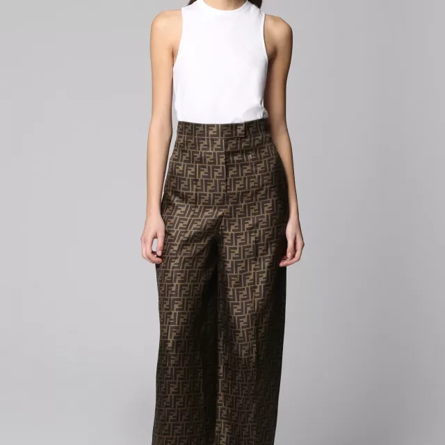 Fendi Brown FF Monogram Silk Twill Wide Leg Pants