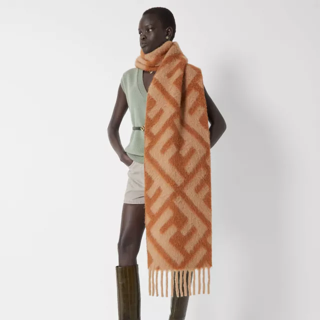 Indulge in the elegance of the Fendi FF Scarf, a statement accessory that blends luxury with comfort. This long, oversized scarf is crafted from a premium mix of alpaca and wool, offering a soft and cozy feel with every wear. The all-over jacquard knit features the iconic FF motif in an eye-catching macro design, displayed in rich camel and brandy tones. This scarf is the perfect way to elevate your look while enjoying ultimate warmth during colder seasons.