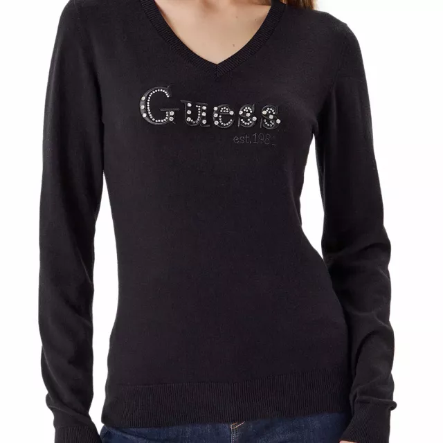 Add the Guess Black V-Neck Rhinestone Knit Sweater to your cart today and discover your new favorite way to stay cozy in style.