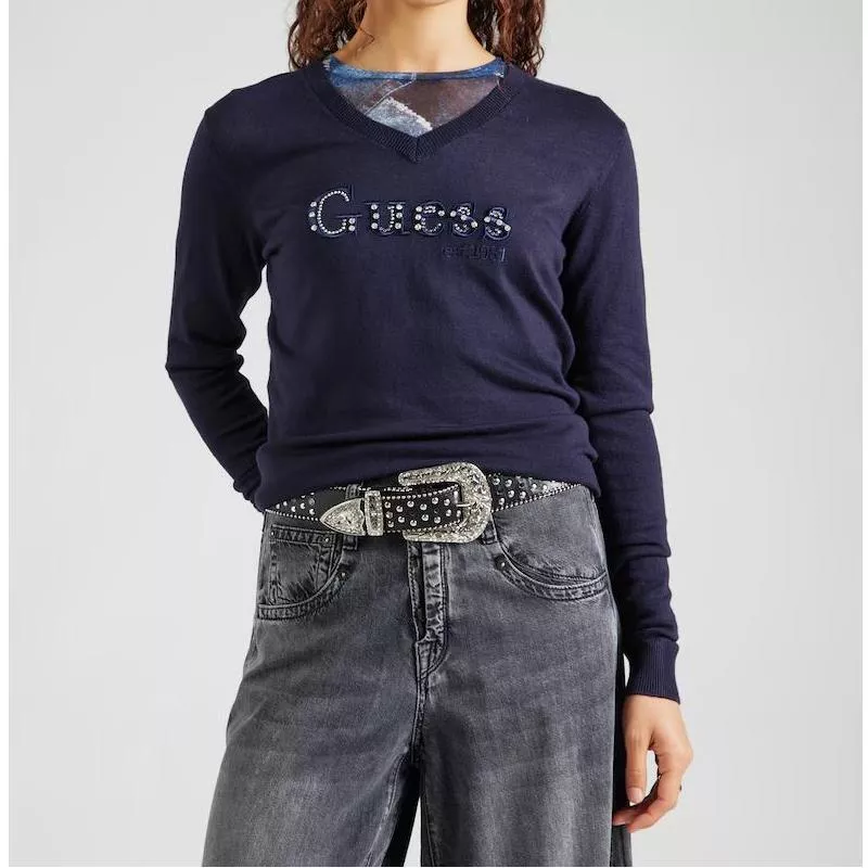 Add the Guess Blue V-Neck Rhinestone Knit Sweater to your cart today and discover your new favorite way to wear color with confidence.