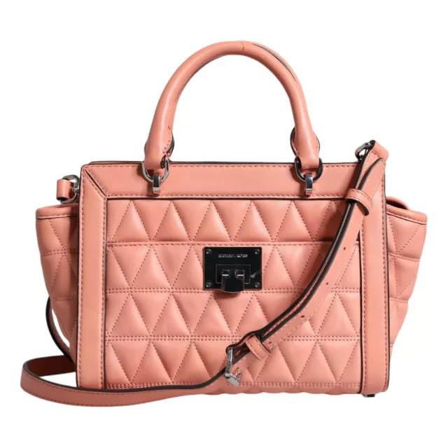 Expertly made in Italy, this Michael Kors messenger bag features silver-tone embossed hardware that radiates understated glamour. The peach hue lends a fresh, feminine charm, while the adjustable and detachable crossbody strap plus two top handles give you the freedom to wear it your way — on the shoulder, crossbody, or as a chic handheld tote. A secure zipper fastening keeps your belongings safe, complemented by a fabric-lined interior for a polished finish.