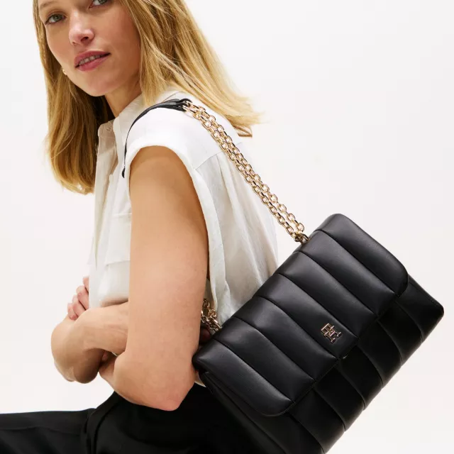This Tommy Hilfiger handbag is perfect for every occasion, whether you’re heading out for a casual day with friends or a more formal event. The sleek black and red design effortlessly transitions from day to night, making it your go-to accessory for any fall or winter outing. Whether you’re carrying your essentials to a lunch date or keeping it stylish for a night on the town, this handbag fits the bill. The versatile shoulder strap allows for hands-free convenience, making it ideal for busy days on the go.